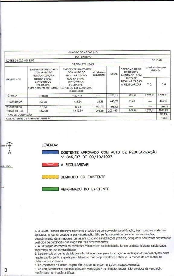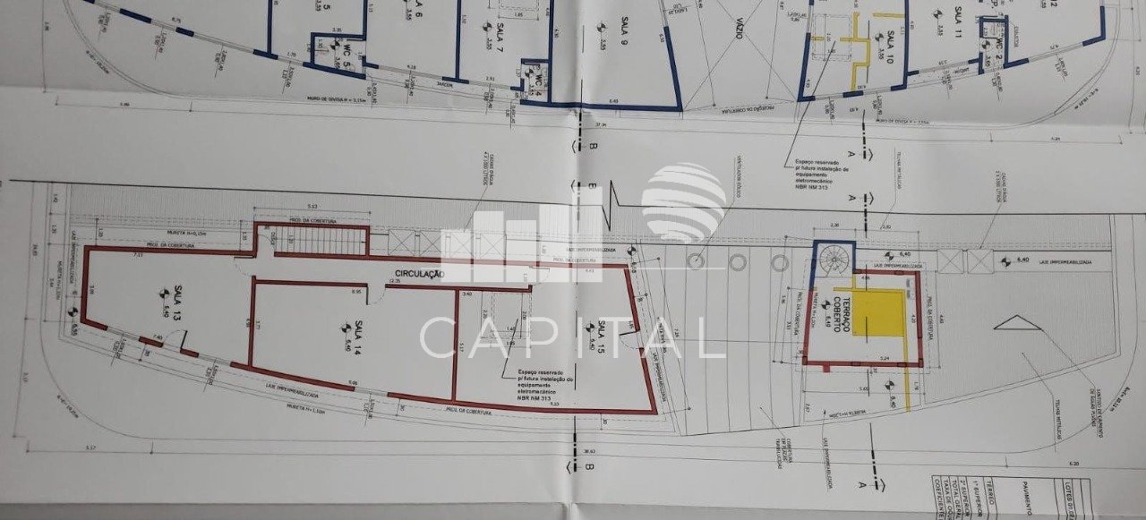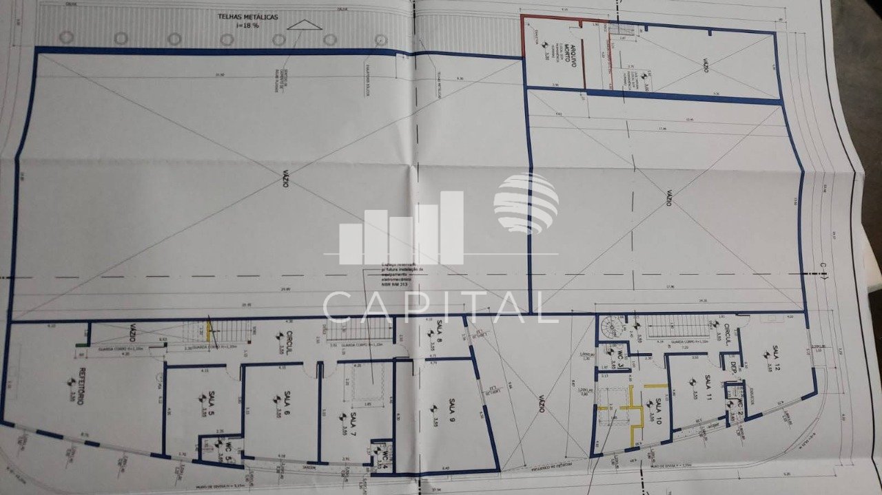 - Pé direito: 10,0m; 8,0m e salas com 3,0m;